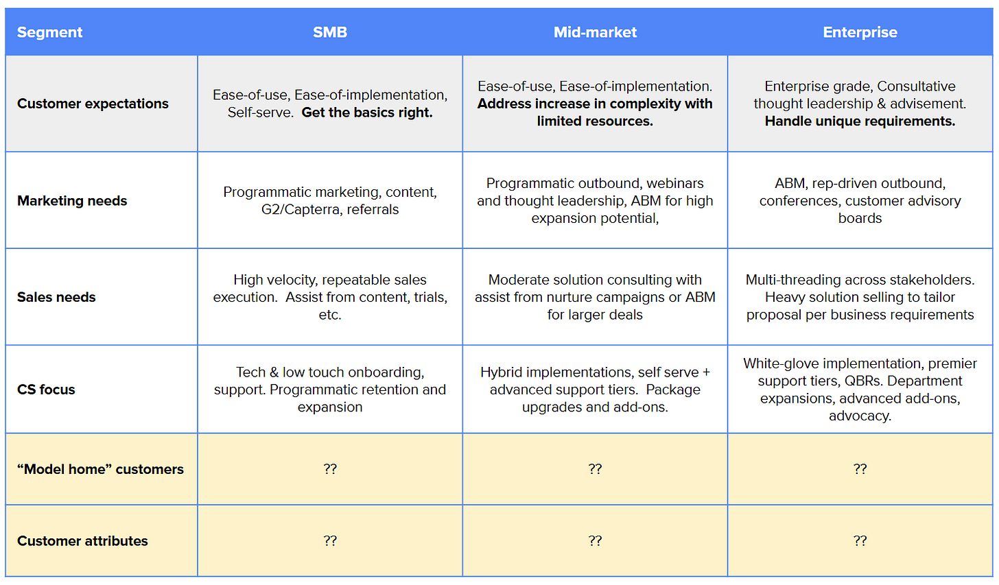 While this approach may be slower than directing segmentation based on instinct, it opens up an objective way to gain rounded perspective from team members and validate those assumptions with customers. Each business has its unique attributes, but having seen this journey across multiple pre-revenue to $30M+ ARR businesses, the below represents common patterns as a starting point.